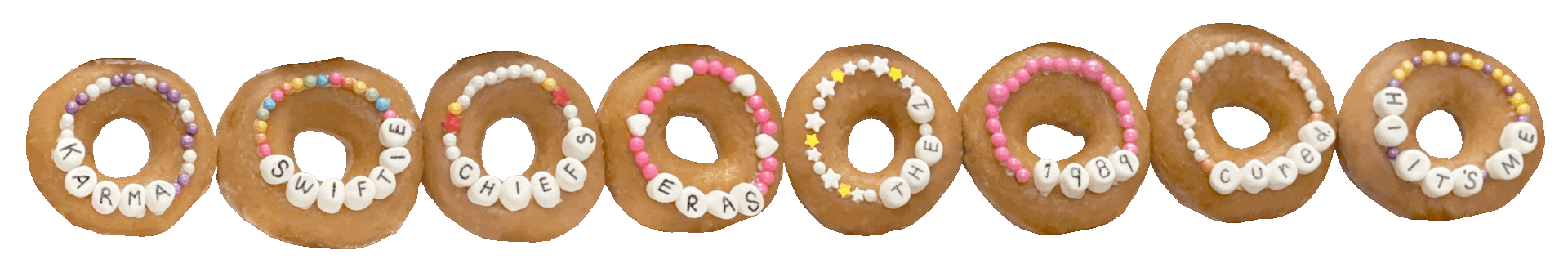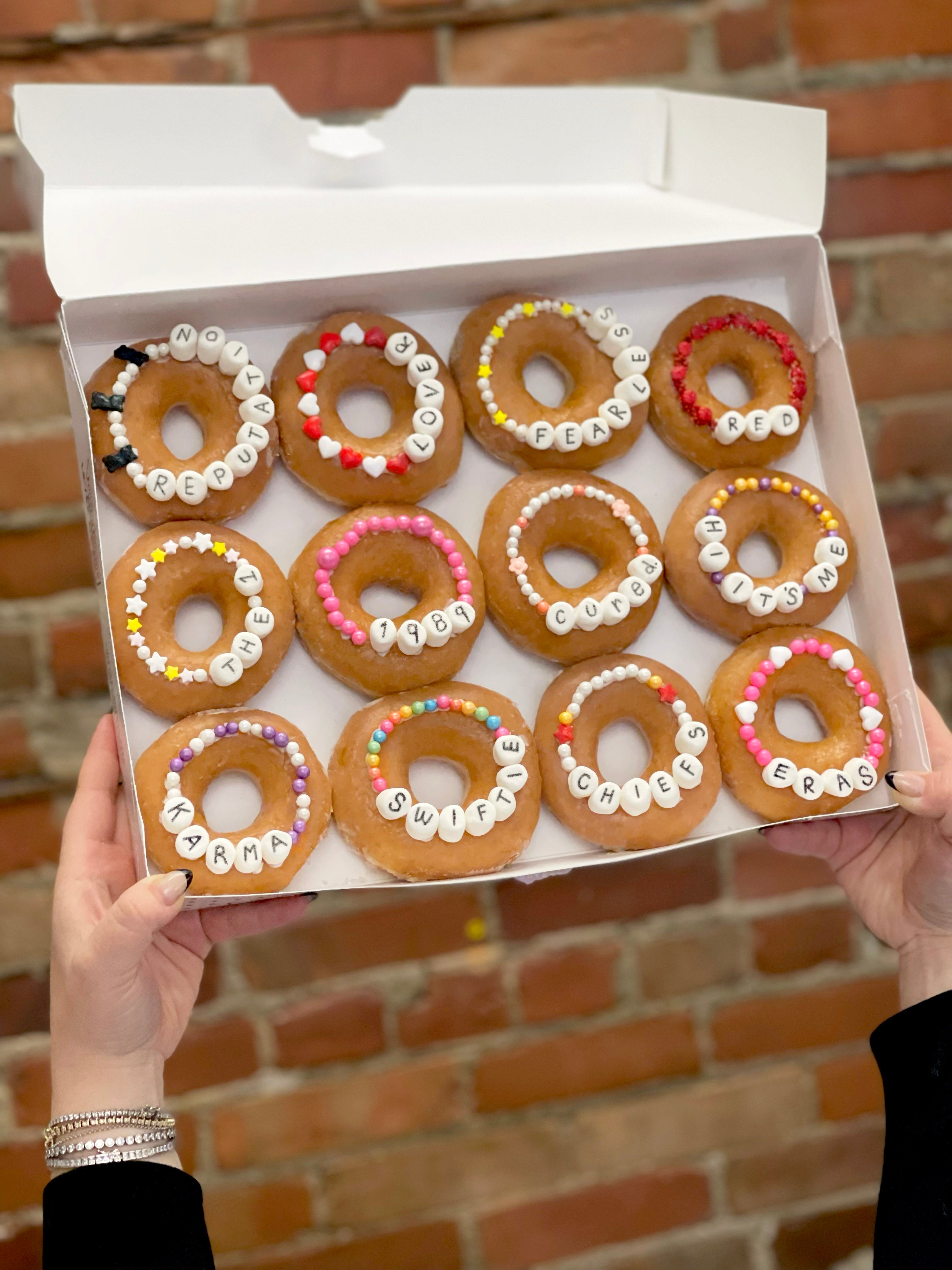 Packed with treats inspired by Taylor’s iconic vibes, this tray has everything you need for a seriously sweet experience. Friendship bracelet donuts and cookies that scream "bestie energy," mini NY Cheesecakes, Caramel Popcorn with a buttery crunch, French Macarons, and so much more!